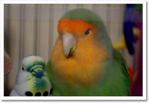 ブルーのセキセイ?ちゃんの横にぴったりと寄り添っております。