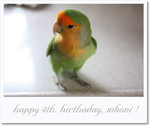 ムボニ君お誕生日おめでとう!4歳だね!先日健康診断で小鳥の病院に行ったのですが、小鳥の病院ゆえに患者さんは小鳥さんばかり。待合室でなにやら小鳥さんをつれてきてる(通な)人同士の会話に耳がダンボになりまして(笑)どうやら小鳥さんには3才の壁なるものがあるらしいのです。魔の3才!病気がおこりやすくなるらしいです。「3才越したの!良かったわねー」という会話でした。なるほど家はまだ2歳だし気をつけなくちゃ!と思ったのをおもいだしました(笑)
