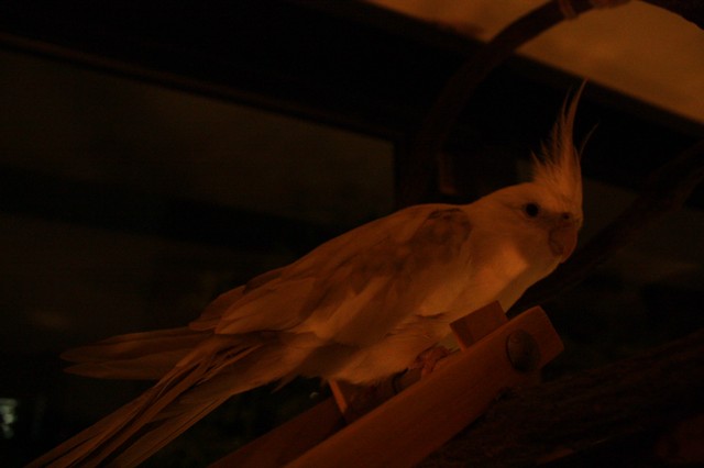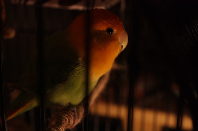 ケージの中のニコちゃん・・・さすがはモデル鳥 横顔も凛々しく。