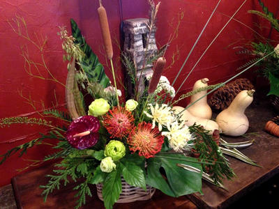 使用花材 : 籠 モンステラ カラテラ あすなろ エミューフェザー タケニクサ