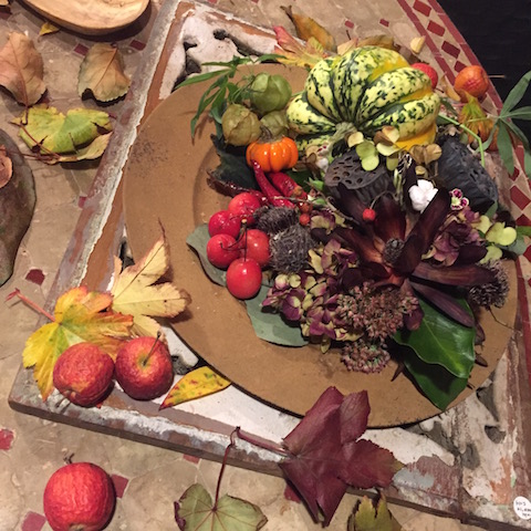 使用花材:かぼちゃ かいどう ティナス アロニア 蓮の実 唐辛子 ベゴニア