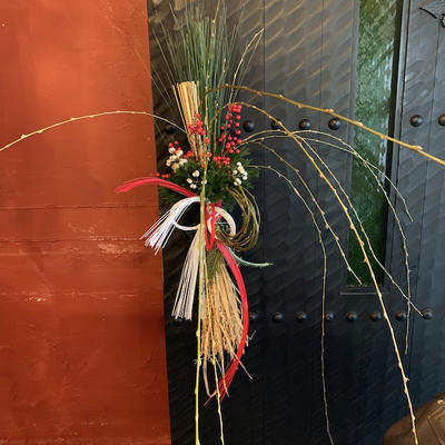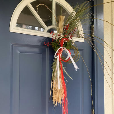 使用花材:柳 山シダ 大王松 万年スギ 米 和紙 南天 水引 南天ハゼ 和紙飾り