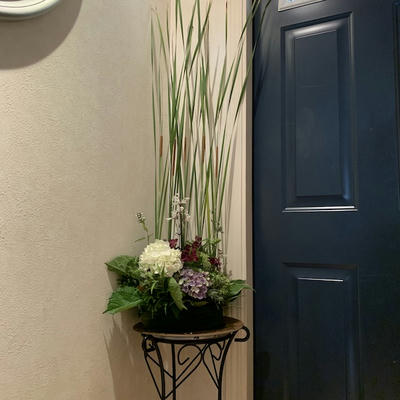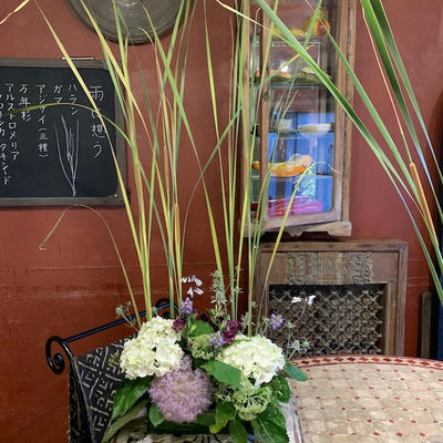 使用花材:ハラン がま アジサイ(3種) 万年スギ アナベル花芽 チョウジソウ