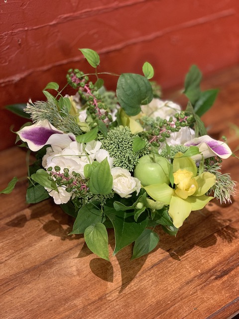 使用花材:谷わたり アンスリーフ リキュウソウ シンピジウム アジサイ りんご