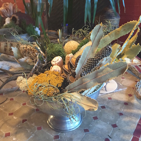 使用花材 : 容器シルバーカップ 豆の鞘 根(ろうで固めたもの) 貝 日影かずら