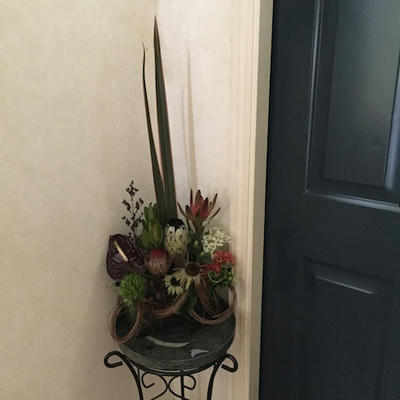 使用花材:アンスリウム ケイトウ ブラックリーフ ニューサイラン クイーンプロテア