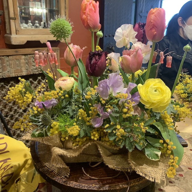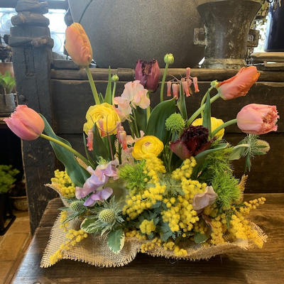 使用花材:チューリップ3種 ラナンキュラス アカシア2種 トリュフ(マム) Jピット