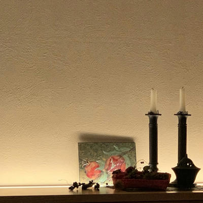 柳は細い花瓶に移し 父の描いたざくろの絵とりんご。