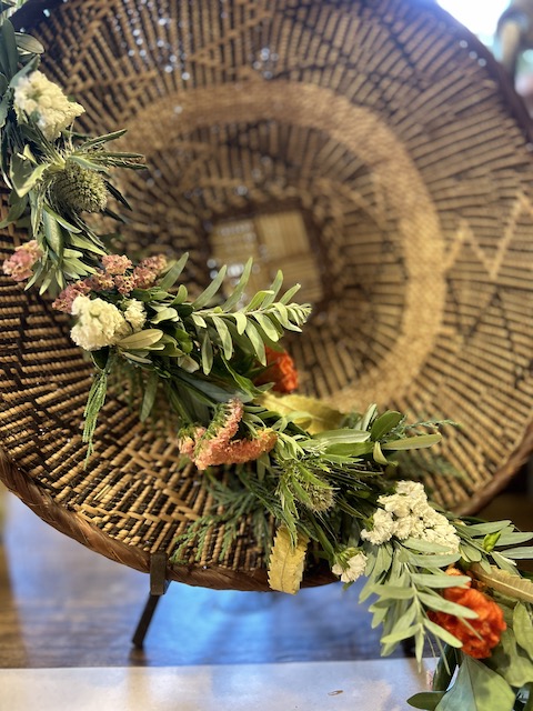 使用花材: オリーブ バンクシアリーフ ブルーブッシュ ユーカリ ヒバ
