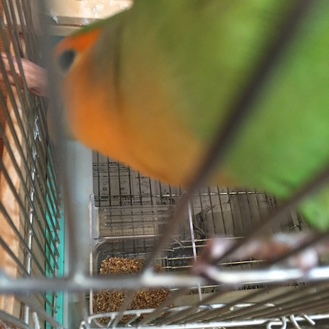 ケージの上半分にしがみつき下に設置してある餌箱&水入れに近づきもしない。