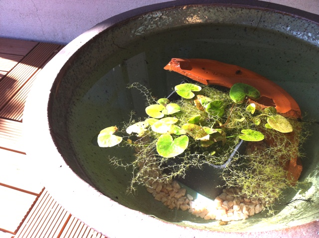 落ち葉と植木鉢のかけらを沈めて寒さ対策。