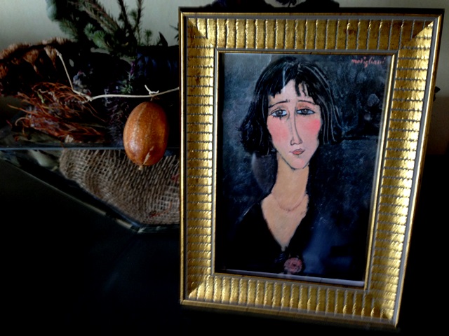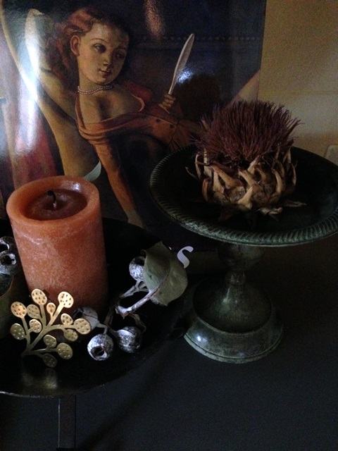 (右アザミが載っているゴブレットみたいな花卉は花教室で買い求めたお気に入り)