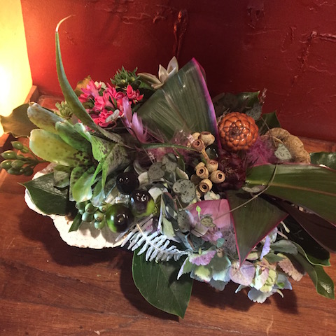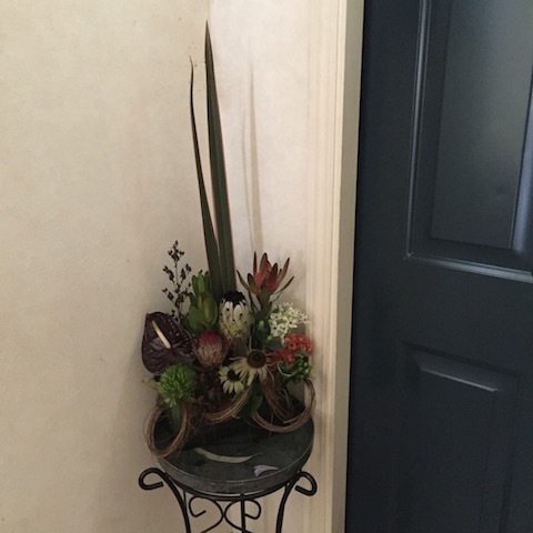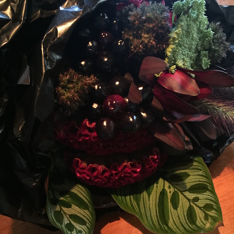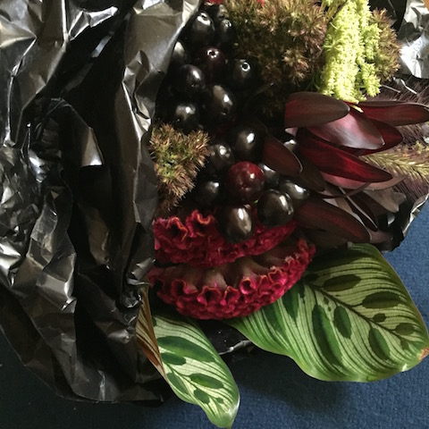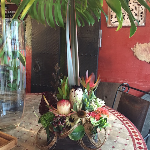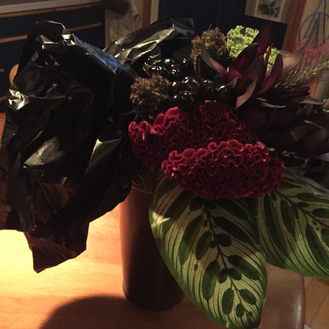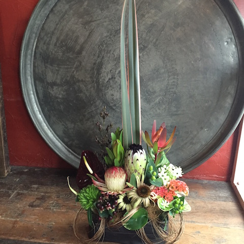 使用花材:アンスリウム ケイトウ ブラックリーフ ニューサイラン クイーンプロテア