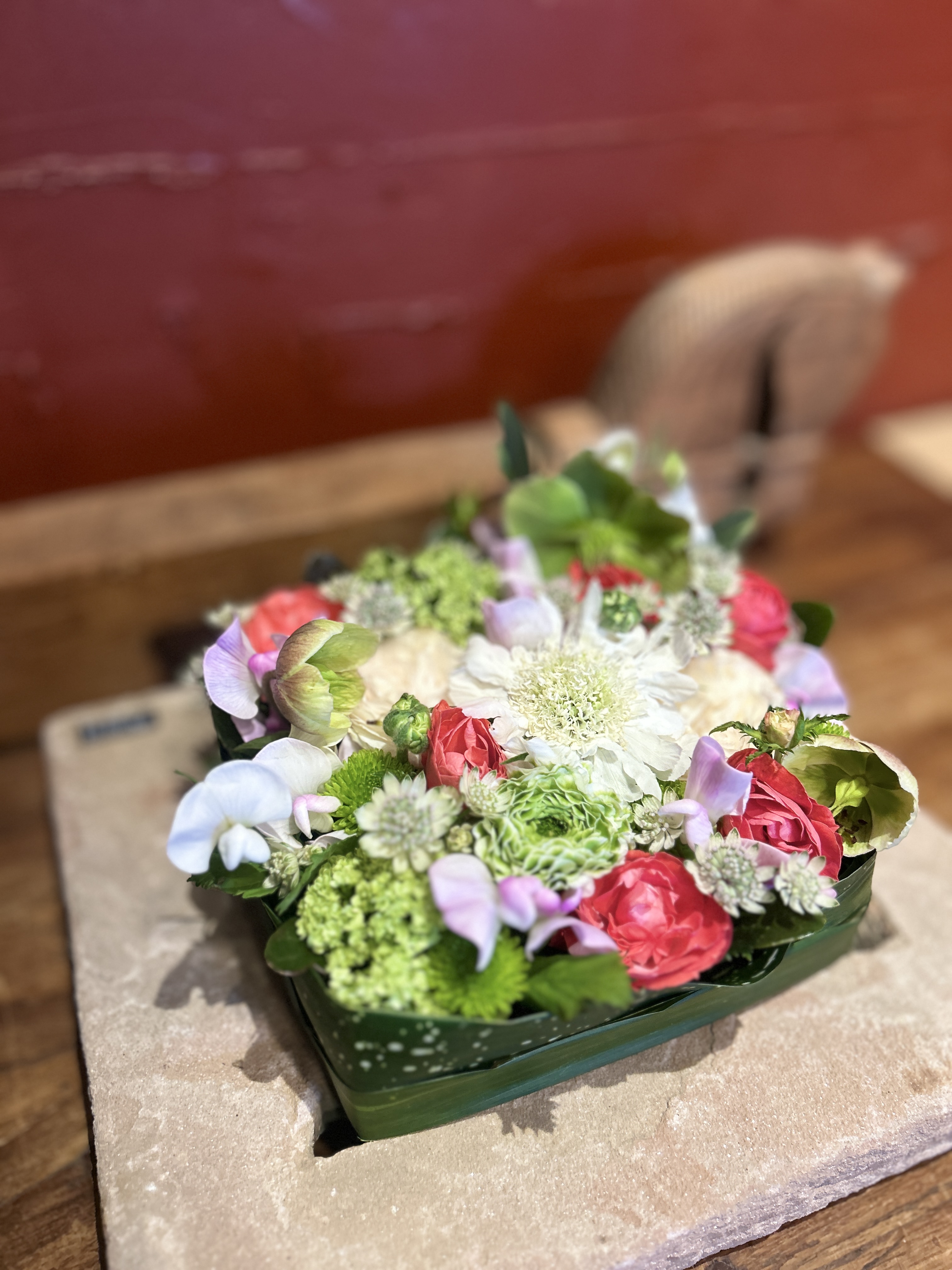 使用花材:ラナンキュラス ビバーナム ジェニーオレンジ スカビオサ クリスマスローズ
