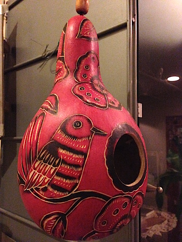 赤い瓢箪に鳥の絵が描かれていて