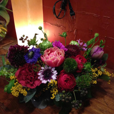 使用花材 : チューリップ・アネモネ・トルコキキョウ・レーズフラワー・ミモザ
