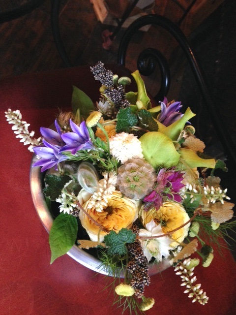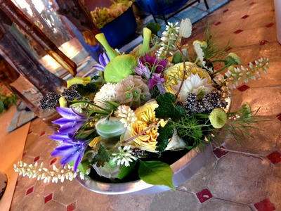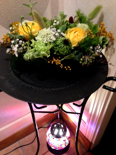 アルミの器に花が零れ落ちそうなくらいのアレンジ。