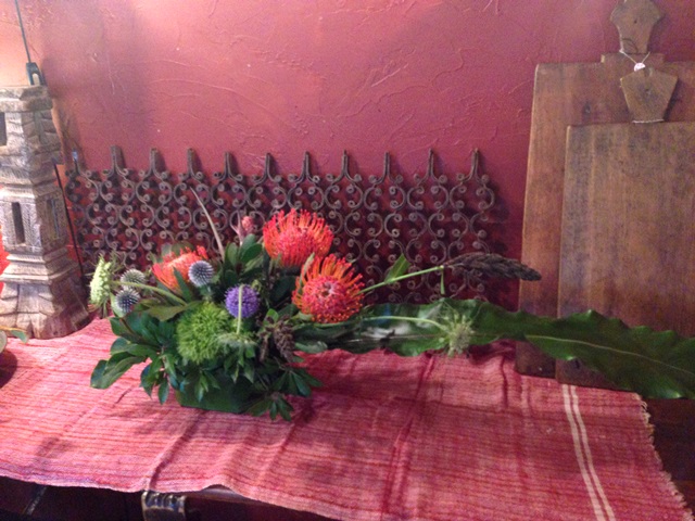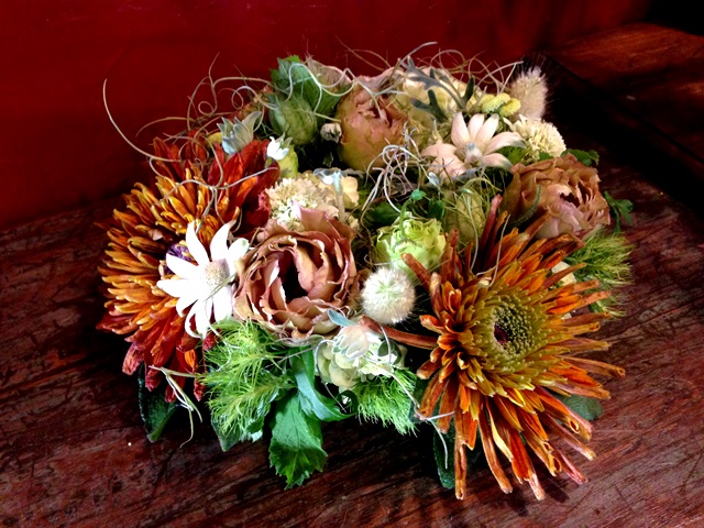 形でなく色で合わせるためどうしても形としては難しい花材になってしまう。