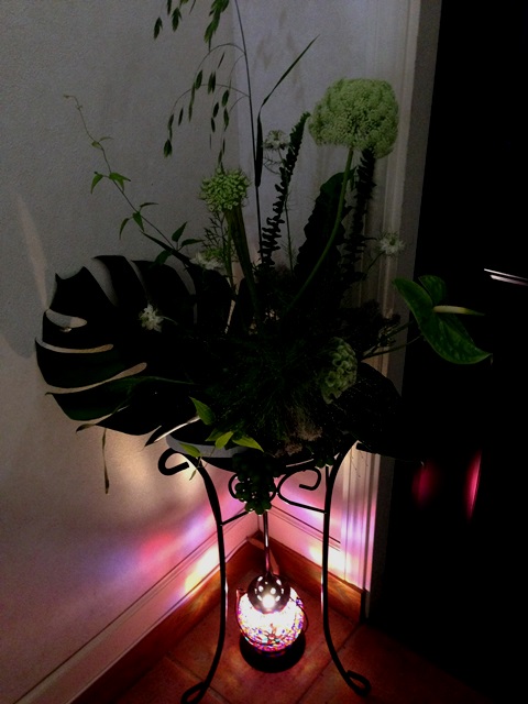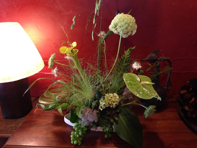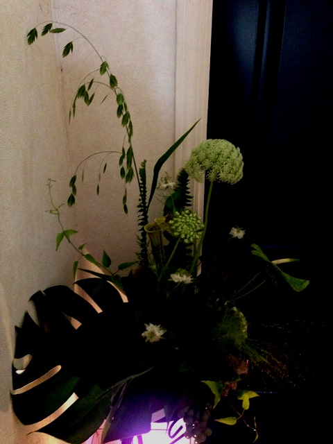 使用花材 : こばんそう モンステラ エメラルドウェーブ ニゲラ けいとう アンスリウム ぶどう
