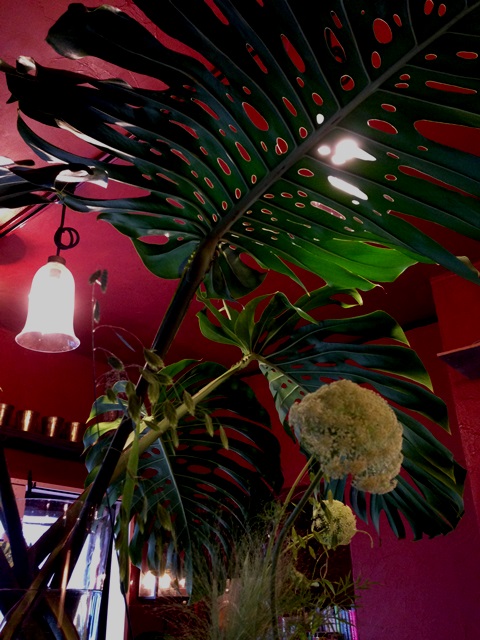 部屋には雨傘のような大きなモンステラ。