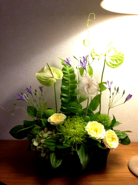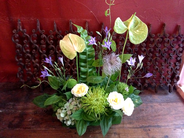 使用花材 : アンスリウム・アジサイ・バラ・マム・りきゅう草・アガパンサス・おきな草・グリーントリュフ