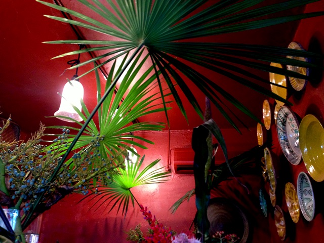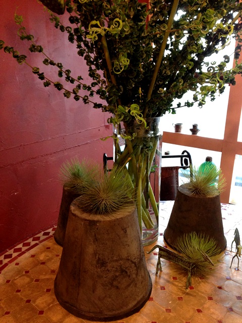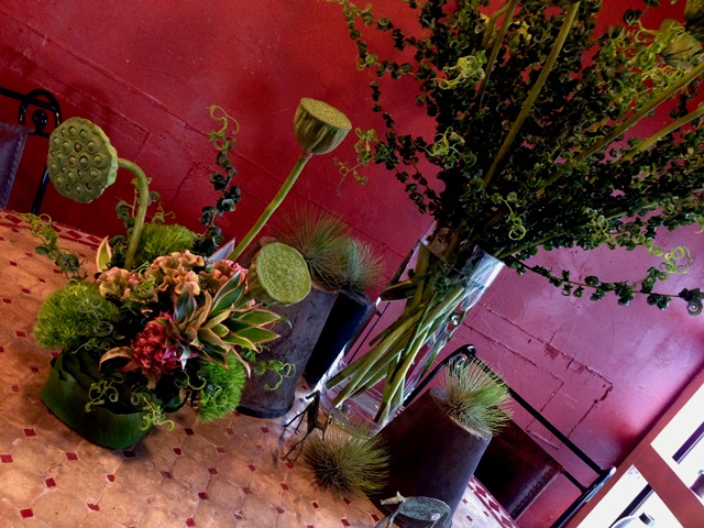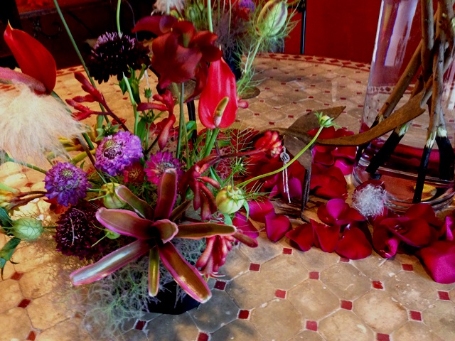 いい色の床に赤い花たちが生き生きと。