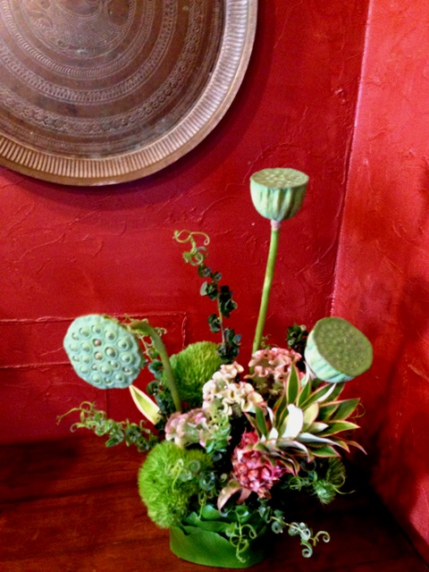 使用花材 : カーリーウイロウ・ハスの葉・けいとう・グリーントリフ・パイナップル