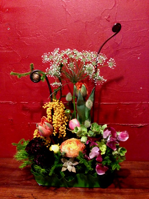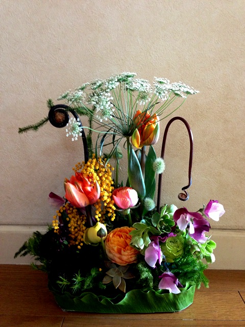 使用花材 : タニワタリ・ヒカゲカズラ・ゼンマイ・レースフラワー・チューリップ・スイトピー