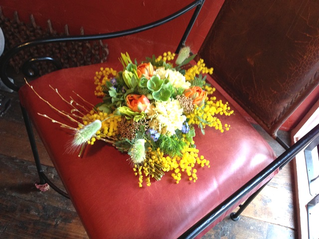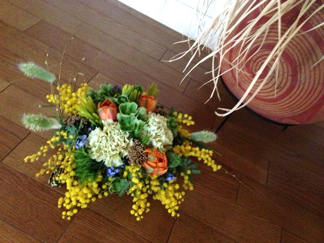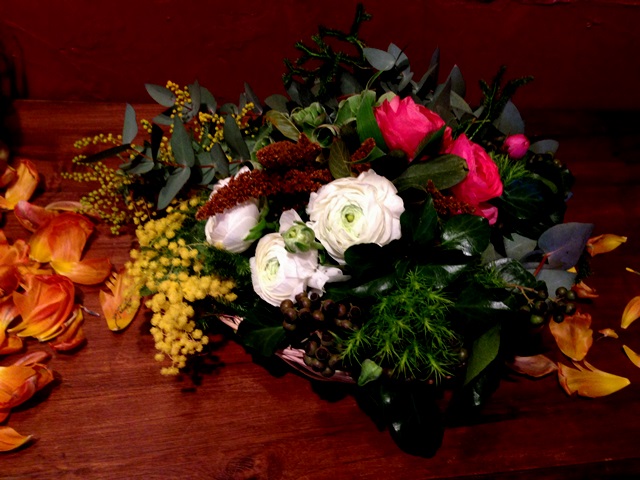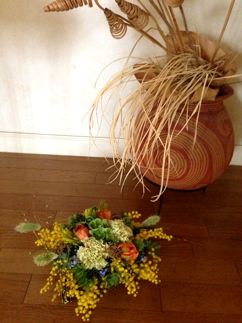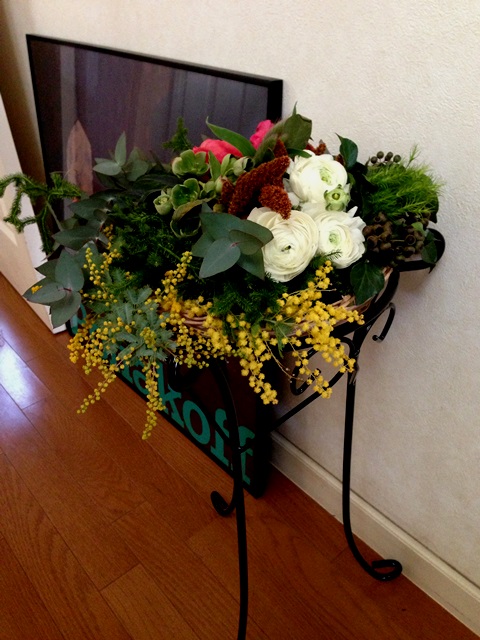 使用花材 : アマランサス・ラナンキュラス・ミモザ・丸葉ユーカリ・日陰カズラ・クリスマスローズ(フェチダス)