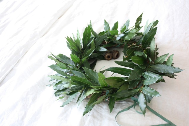 クリスマスに使ったリースの台に月桂樹の葉っぱをさしてみた。