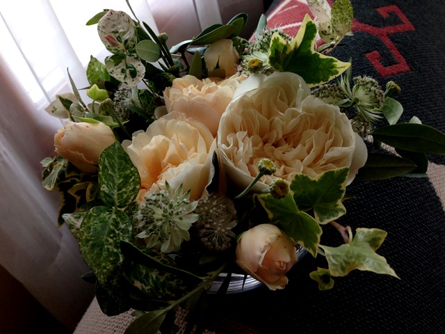 バラ2種がベージュなので白~ベージュ~グリーンでまとめてみた。