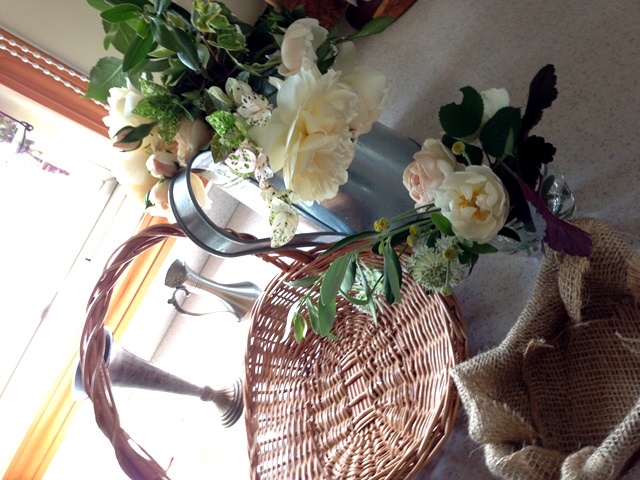 庭で咲き乱れているバラや小花を摘んできてアレンジを作って