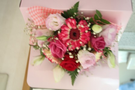 アレンジ済みのピンクの箱に入った可愛らしい花。