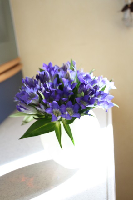 乳白色の花瓶に紫が映える。