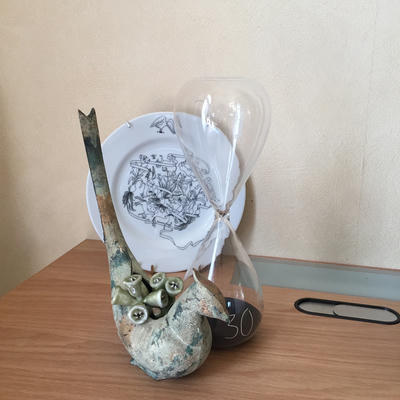 左側も定番の pass the batton の絵皿と砂時計とこれまた鳥の花瓶。
